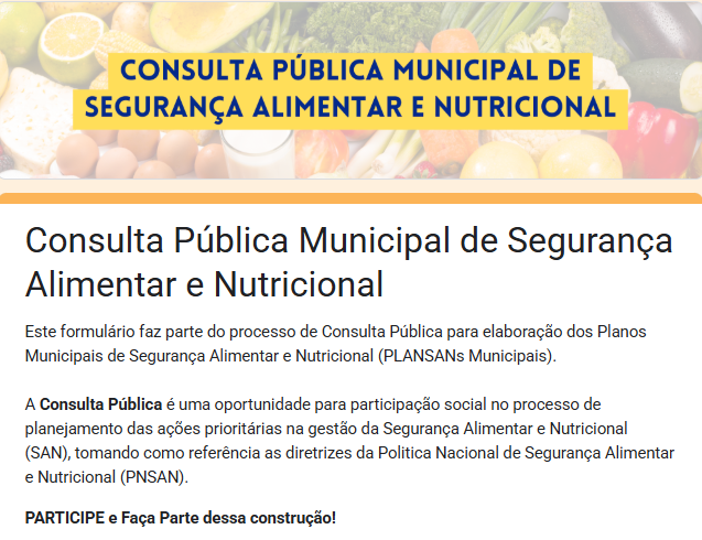 Este conteúdo orienta como participar de Consulta Pública sobre o Plano Municipal de Segurança Alimentar e Nutricional (PLANSAN).